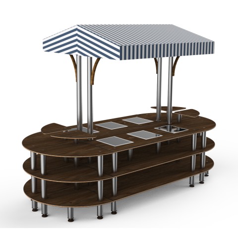 Mogogo Buffet Solutions Modular Warming Nemco Induction Market Station, 3-tier, drop-in, 6 well, 130" x 59" x 96"H, rounded, touch control, (4) triangular shelves, Bengali mango wood BHP high pressure laminate with bamboo core top, white/blue canopy, brus