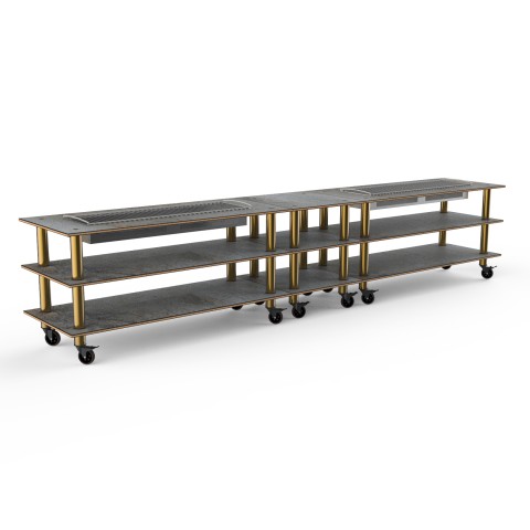 Mogogo Buffet Solutions Modular Double Heat Buffet Table, 3-tier, drop-in, double well, 171-1/2" x 29-1/2" x 36-1/2"H, rectangular, canned heat, grey slate BHP high pressure laminate with bamboo core top, black canopy, brushed brass casters, knocked down