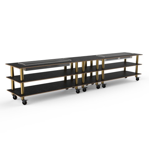 Mogogo Buffet Solutions Modular Double Heat Buffet Table, 3-tier, drop-in, double well, 171-1/2" x 29-1/2" x 36-1/2"H, rectangular, canned heat, Nero Marquina BHP high pressure laminate with bamboo core top, black canopy, brushed brass casters, knocked do