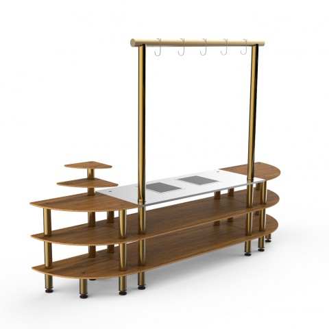 Mogogo Buffet Solutions Modular Streamline Arch Nemco Induction Station, 3-tier, drop-in, double well, 130" x 29-1/2" x 96"H, (2) shelves, (5) hooks, high density bamboo finish, brushed brass legs, 1800 watt, 120v, 15 amp, knocked down