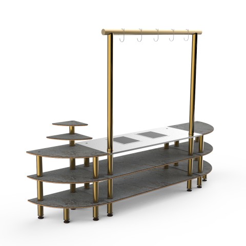Mogogo Buffet Solutions Modular Streamline Arch Nemco Induction Station, 3-tier, drop-in, double well, 130" x 29-1/2" x 96"H, (2) shelves, (5) hooks, grey slate BHP high pressure laminate with bamboo core top, brushed brass legs, 1800 watt, 120v, 15 amp,
