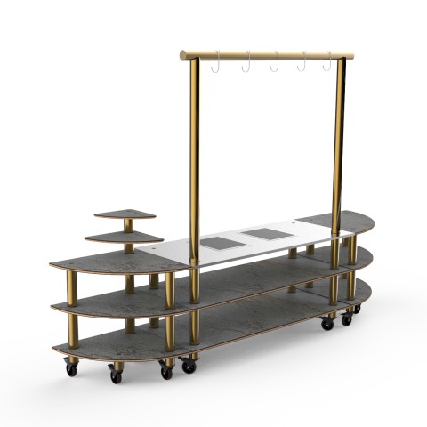 Mogogo Buffet Solutions Modular Streamline Arch Nemco Induction Station, 3-tier, drop-in, double well, 130" x 29-1/2" x 96"H, (2) shelves, (5) hooks, grey slate BHP high pressure laminate with bamboo core top, brushed brass casters, 1800 watt, 120v, 15 am