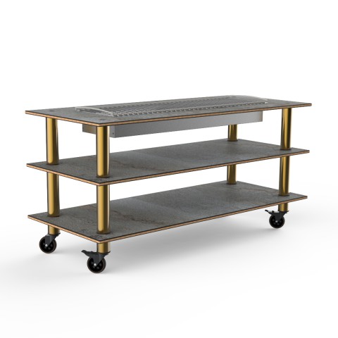 Mogogo Buffet Solutions Modular Heat Table, 3-tier, 71" x 29-1/2" x 35"H, rectangular, grey slate BHP high pressure laminate with bamboo core top, brushed brass casters, knocked down