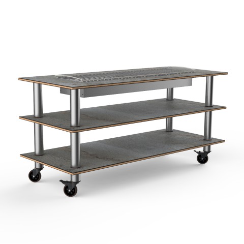 Mogogo Buffet Solutions Modular Heat Table, 3-tier, 71" x 29-1/2" x 35"H, rectangular, grey slate BHP high pressure laminate with bamboo core top, brushed stainless steel casters, knocked down