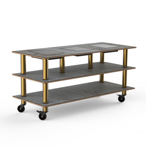 Mogogo Buffet Solutions Modular Nemco Induction Warming Unit, 3-tier, 71" x 29-1/2" x 35"H, rectangular, triple well, touch control, grey slate BHP high pressure laminate with bamboo core top, brushed brass casters, 270 watt, 120v, 2.2 amp, knocked down (