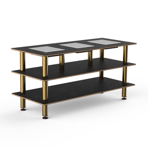 Mogogo Buffet Solutions Modular Nemco Induction Warming Unit, 3-tier, 71" x 29-1/2" x 35"H, rectangular, triple well, touch control, Nero Marquina marble BHP high pressure laminate with bamboo core top, brushed brass legs, 270 watt, 120v, 2.2 amp, knocked