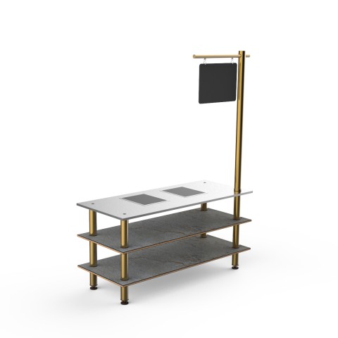 Mogogo Buffet Solutions Modular Nemco Pro Cooking Induction, 3-tier, 71" x 29-1/2" x 35"H, double well, rectangular, with sign post, grey slate BHP high pressure laminate with bamboo core top, brushed brass legs, 1800 watt, 120v, 15 amp, knocked down (sto