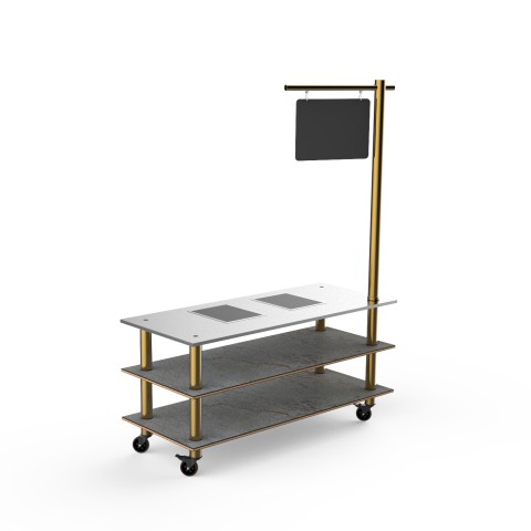 Mogogo Buffet Solutions Modular Nemco Pro Cooking Induction, 3-tier, 71" x 29-1/2" x 35"H, double well, rectangular, with sign post, grey slate BHP high pressure laminate with bamboo core top, brushed brass casters, 1800 watt, 120v, 15 amp, knocked down (