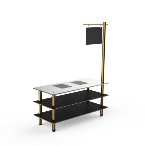 Mogogo Buffet Solutions Modular Nemco Pro Cooking Induction, 3-tier, 71" x 29-1/2" x 35"H, double well, rectangular, with sign post, Nero Marquina marble BHP high pressure laminate with bamboo core top, brushed brass legs, 1800 watt, 120v, 15 amp, knocked