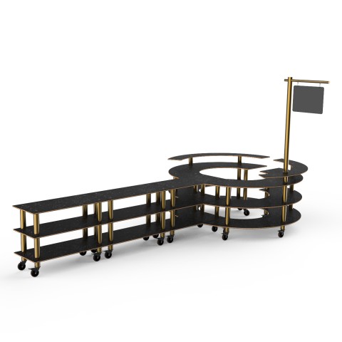 Mogogo Buffet Solutions Modular Creative DIY Station, 4-tier, 205" x 98" x 101"H, Nero Marquina marble BHP high pressure laminate with bamboo core top, brushed brass casters, knockdown