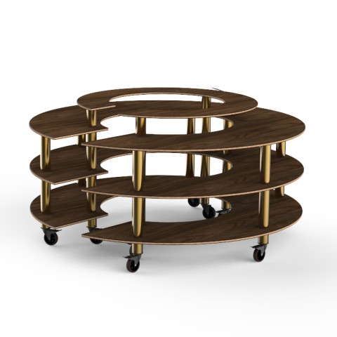 Mogogo Buffet Solutions Modular Market Station, 4-tier, 81-1/2" dia. x 41"H, round, Bengali mango wood BHP high pressure laminate with bamboo core top, brushed brass casters, knockdown