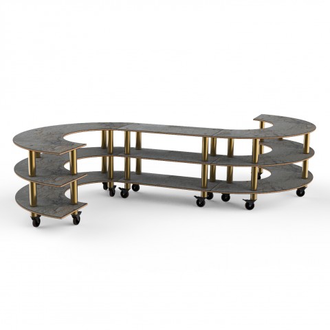 Mogogo Buffet Solutions Modular Serving Station, 3-tier, 141-1/2" x 124" x 35"H, s-shaped, grey slate BHP high pressure laminate with bamboo core top, brushed brass casters, knockdown
