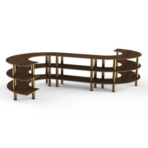 Mogogo Buffet Solutions Modular Serving Station, 3-tier, 141-1/2" x 124" x 35"H, s-shaped, Bengali mango wood BHP high pressure laminate with bamboo core top, brushed brass legs, knockdown