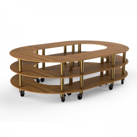 Mogogo Buffet Solutions Modular Creative Serving Station, 3-tier, 129" x 81-1/2" x 35"H, full stadium shaped, high density bamboo finish, brushed brass casters, knockdown