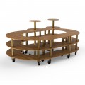 Mogogo Buffet Solutions Modular Creative Serving Station, 3-tier, 129" x 81-1/2" x 55"H, kidney shape, closed stadium, with (2) round display tables, high density bamboo finish, brushed brass casters, knockdown