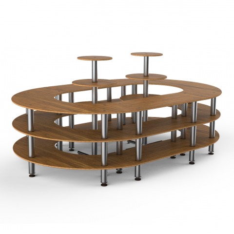 Mogogo Buffet Solutions Modular Creative Serving Station, 3-tier, 129" x 81-1/2" x 55"H, kidney shape, closed stadium, with (2) round display tables, high density bamboo finish, brushed stainless steel legs, knockdown