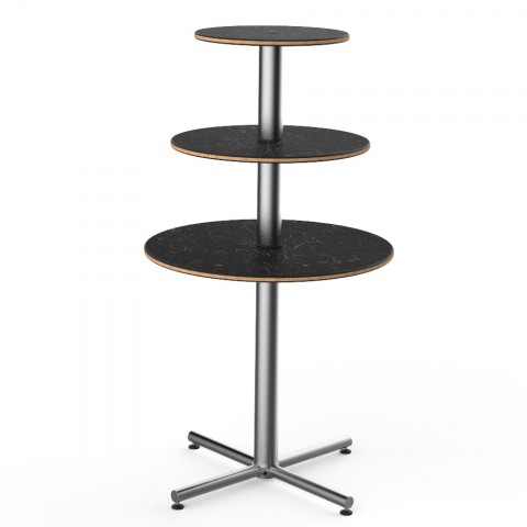 Mogogo Buffet Solutions Polo Display Table, 3-tier, 30" dia. x 55"H, round, Nero Marquina marble BHP high pressure laminate with bamboo core top, brushed stainless steel segments, knockdown