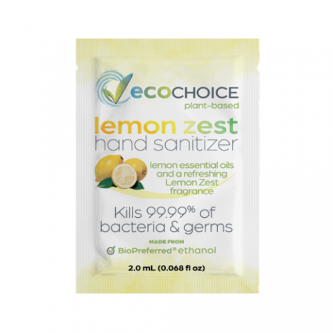 Hand Sanitizer, disposable single use 2mL packet, 70% alcohol, plant based ethanol formula, lemon zest scent, FDA registered gel formula, Made in USA (2000 per case) (Delivered Price)