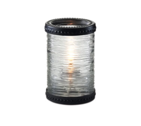 Industrial Chic Madison Twister Lamp, 5" H x 3 1/8" dia., cylinder, round, with bronze accent rings, twister textured glass, clear, should be used with: 24, 30, 36, or 50 hour Soft Light® liquid wax candles (30510 & 30512 & 30514 & 30516) or flameless rechargeable candle set, 6 each per case (Add freight - Collect unless otherwise noted)