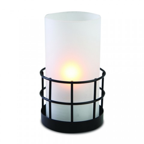 Industrial Chic Gridiron Lamp, 5-1/2"H x 3-1/4" dia., frost globe, black metal base, should be used with: 24, 30, 36, or 50 hour Soft Light® liquid wax candles (30510 & 30512 & 30514 & 30516) or flameless rechargeable candle set, 6 each per case (Add freight - Collect unless otherwise noted)(to be discontinued, contact factory for availability)