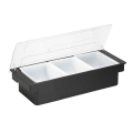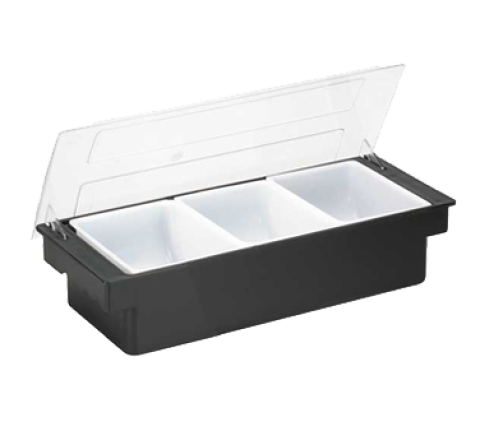 Bar Condiment Holder, 19-1/2" x 6" x 4-1/2", (3) 1 qt. white inserts, with clear lid, dishwasher safe, ABS plastic, black (1 each minimum order)