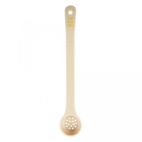 Spoonout, 1 oz., 11.625" x 2" x .875", perforated, long handle with yellow capacity markings (oz/ml), polycarbonate, beige, NSF (1 each minimum order)