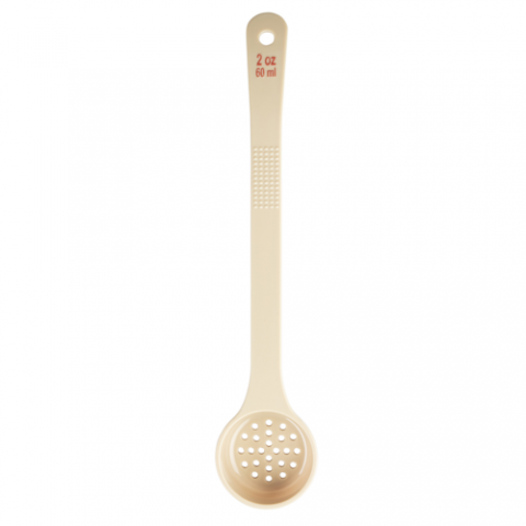 Spoonout, 2 oz., 12.125" x 2.5" x 1", perforated, long handle with red capacity markings (oz/ml), polycarbonate, beige, NSF (1 each minimum order)