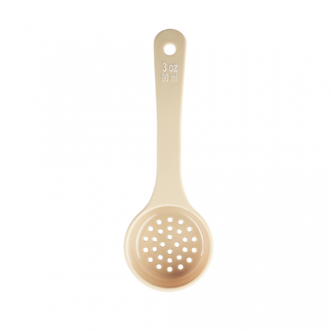 Spoonout, 3 oz., 8.125" x 2.75" x 1.25", perforated, short handle with white capacity markings (oz/ml), polycarbonate, beige, NSF (1 each minimum order)