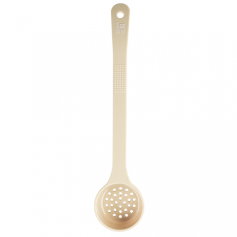 Spoonout, 3 oz., 12.375" x 2.75" x 1.25", perforated, long handle with white capacity markings (oz/ml), polycarbonate, beige, NSF (1 each minimum order)