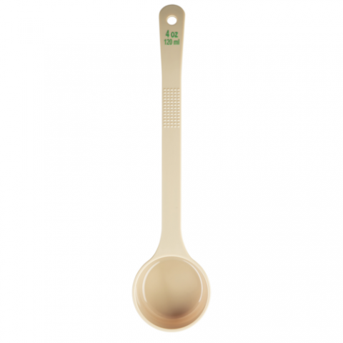 Spoonout, 4 oz., 12.625" x 3" x 1.5", solid, long handle with green capacity markings (oz/ml), polycarbonate, beige, NSF (1 each minimum order)