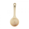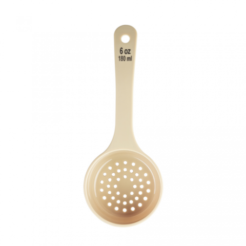 Spoonout, 6 oz., 8.75" x 3.375" x 1.625", perforated, short handle with black capacity markings (oz/ml), polycarbonate, beige, NSF (1 each minimum order)