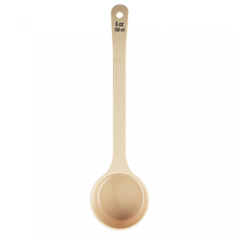 Spoonout, 6 oz., 13" x 3.75" x 1.625", solid, long handle with black capacity markings (oz/ml), polycarbonate, beige, NSF (1 each minimum order)