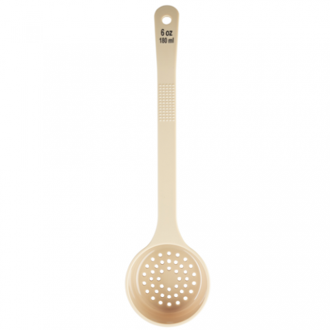 Spoonout, 6 oz., 13" x 3.375" x 1.625", perforated, long handle with black capacity markings (oz/ml), polycarbonate, beige, NSF (1 each minimum order)