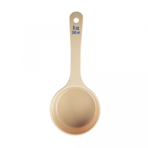 Spoonout, 8 oz., 9.125" x 3.75" x 1.75", solid, short handle with blue capacity markings (oz/ml), polycarbonate, beige, NSF (1 each minimum order)