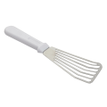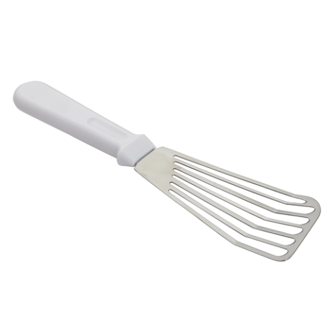 Fish Turner, 6" x 2-7/8" x 5/8", dishwasher safe, stainless steel with white plastic handle (1 each minimum order)