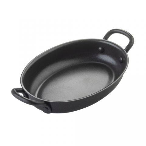 Mini Serving Fry Pan, 12 oz., 8.25"x4.625"x1.625", oval, with black handle, black non-stick coating over steel (1 each minimum order)