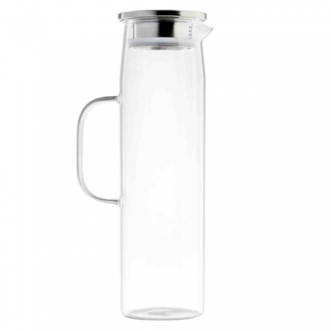 Glass Pitchers, 50 oz., with stainless steel dispensing lids, 5-1/4" x 3-1/2" x 12-1/4", glass (borosilicate), Cash & Carry (1 each minimum order)