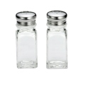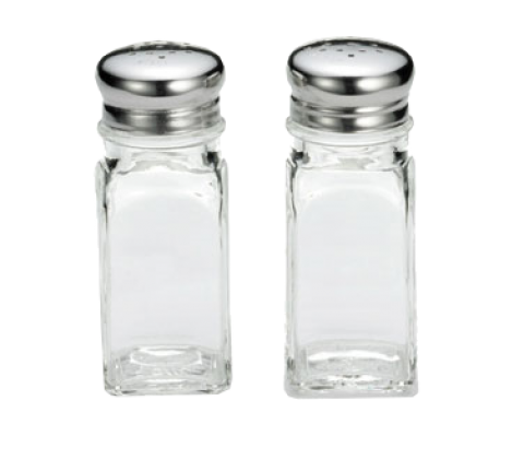 Salt/Pepper Shaker, 3 oz., 1-1/2" x 4"H, square clear glass, dishwasher safe, stainless steel tops (fits rack model numbers 609R & 609RBK) (must be purchased in multiples of 12 each)