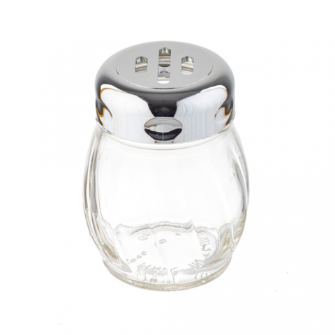 Cheese Shaker, slotted, swirl design, chrome plated top, glass, clear (must be purchased in multiples of 12 each)
