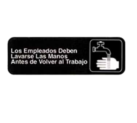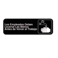 Cash & Carry Sign, 3" x 9", "Los Empleados Deben Lavarse Las Manos Antes de Volver al Trabajo" (Employees Must Wash Hands Before Returning to Work), white on black, pressure sensitive adhesive backing, dishwasher safe, plastic (Spanish) (1 each minimum order)