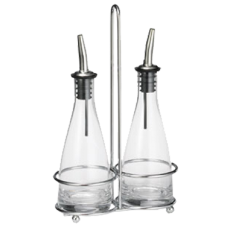 Siena™ Oil and Vinegar Set, (2) 6 oz. clear glass bottles (dishwasher safe), stainless steel pourers (hand wash only), chrome plated rack (hand wash only) (1 set minimum order)