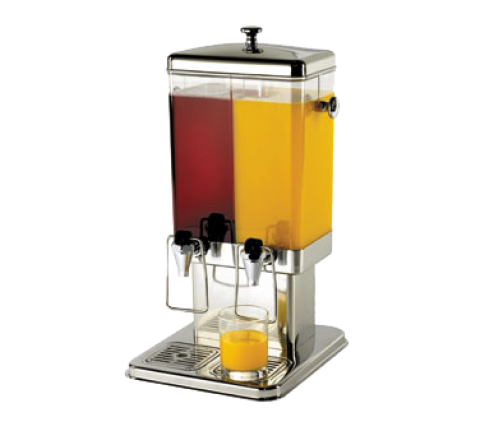Beverage Dispenser, (2) 1-1/2 gallon reservoirs, 12" x 13-7/8" x 23"H, 5-1/2" faucet clearance, built in ice chamber, dishwasher safe, polycarbonate, stainless steel base (1 each minimum order)