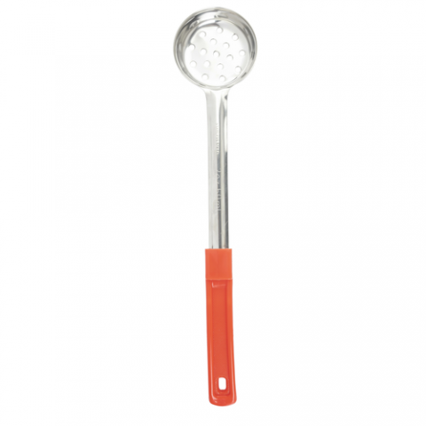 Spoonout, 2 oz., one-piece, perforated, dishwasher safe, red handle, stainless steel (1 each minimum order)