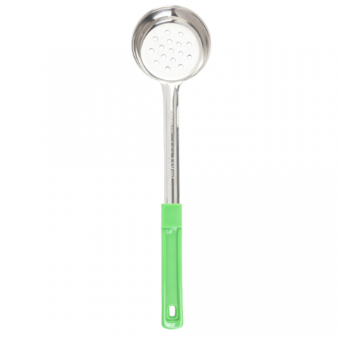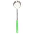 Spoonout, 4 oz., one-piece, perforated, dishwasher safe, green handle, stainless steel (1 each minimum order)