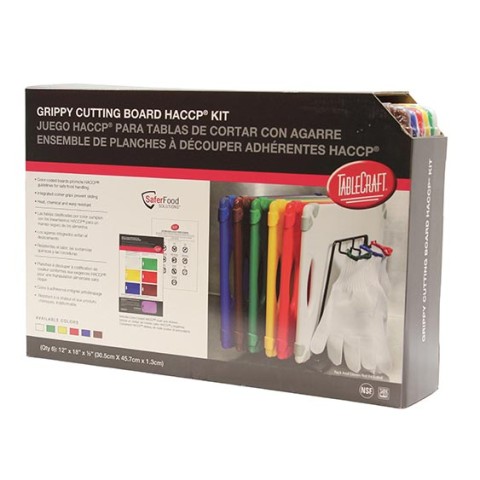Cash & Carry Grippy Cutting Board HACCP® Kit, 12" x 18", integrated handle, anti-slip grips, integrated measurements (cm/in), heat, chemical & warp resistant, dishwasher safe, includes (1) of each color: white, green, yellow, red, blue, brown, meets HACCP guidelines, NSF (1 kit minimum order)