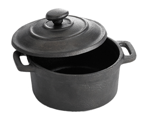 Mini Casserole Dish, 8 oz., 4" dia. x 1-3/4"H (5" O.A.L.), round, with handles & lid, hand wash only, non-stick, cast iron (1 each minimum order)
