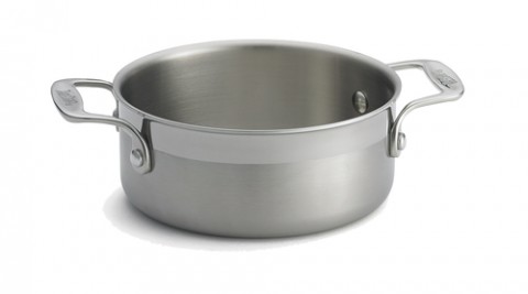 Sauce Pan, 4 qt., 8-3/8" x 4-7/8", without lid, loop handles, tri-ply, safe for stove top, hot plate, gas, steam, induction and oven use, riveted handles, dishwasher safe, Duracoatâ„¢ coated cast aluminum, 18/8 stainless steel interior and exterior, brushed finish, NSF (1 each minimum order)