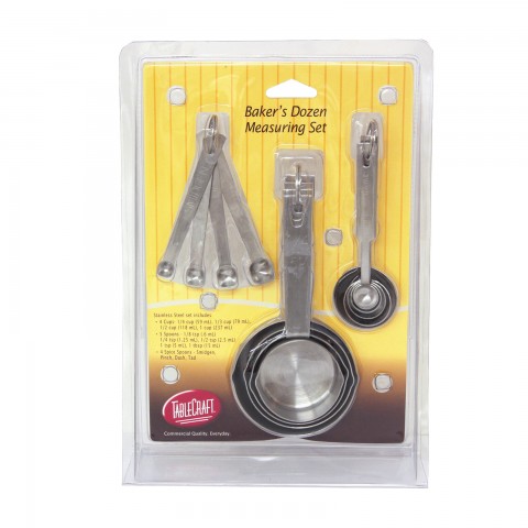 Cash & Carry Baker's Dozen Measuring Set, 13 piece set, includes: 4 cups (1/4, 1/3, 1/2 & 1 cup), 5 spoons (1/8 tsp, 1/4 tsp, 1/2 tsp & 1 tbsp.), 4 spice spoons (smidgen, pinch, dash & tad), dishwasher safe, stainless steel (must be purchased in multiples of 6 sets)