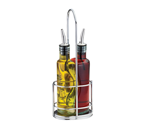 Cash & Carry Gemelli™ Bottle Set, (2) 8-1/2 oz. embracing green tint glass bottles (dishwasher safe), stainless steel pourer (hand wash only), chrome plated rack (hand wash only) (must be purchased in multiples of 6 sets)