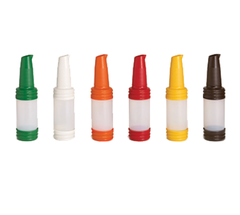 Cash & Carry PourMaster® Complete Unit, 1 quart, assorted color-coded caps, 2 of each color: brown, green, red, orange, white & yellow, includes: container, PourMaster® V-Neck Top™ & StorMaster™ cap, dishwasher safe, polyethylene, BPA free, NSF (must be purchased in multiples of 12 each)